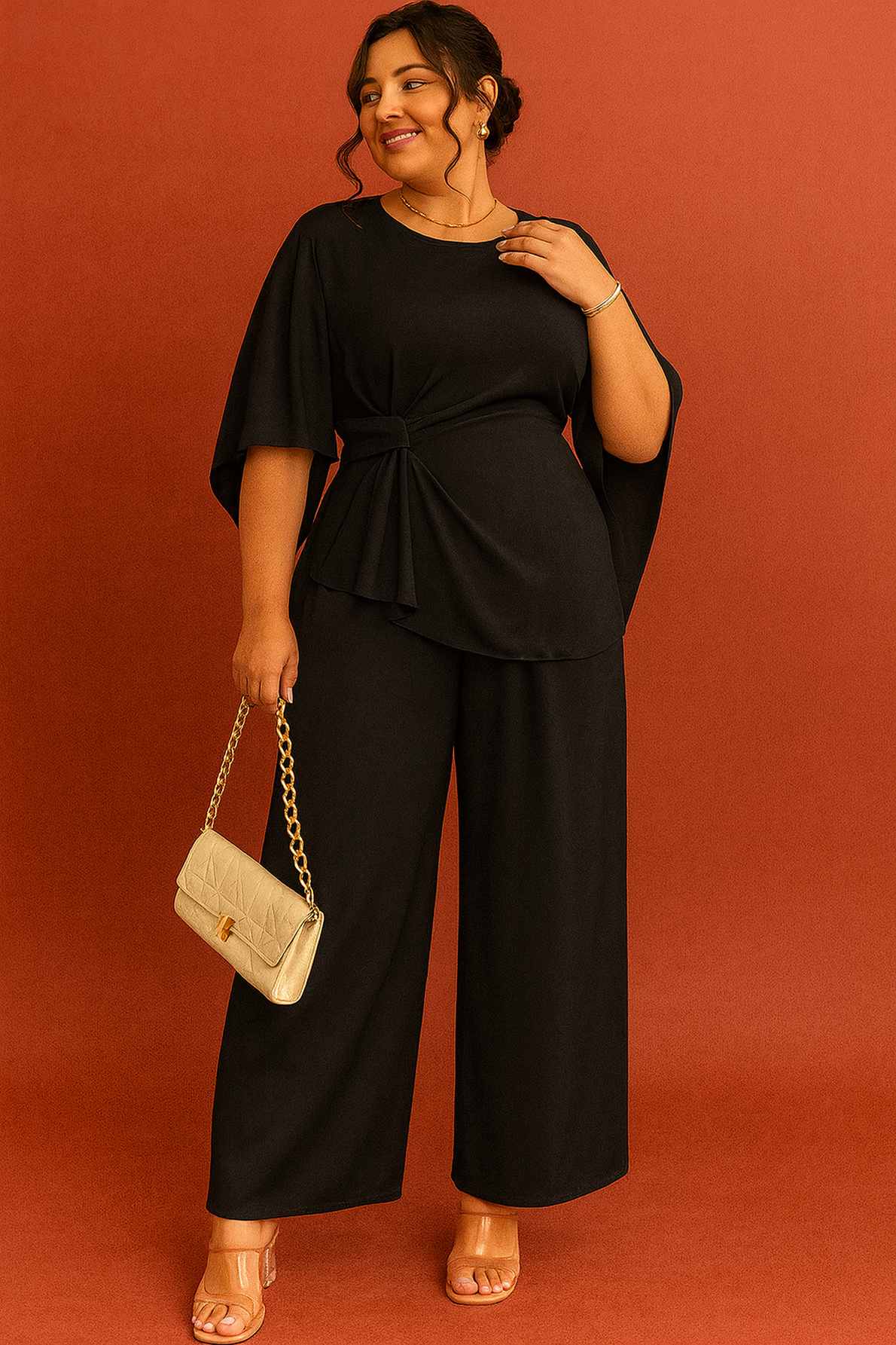 Conjunto 2 piezas top manga con volante plisado y pantalón de pierna ancha, Negro