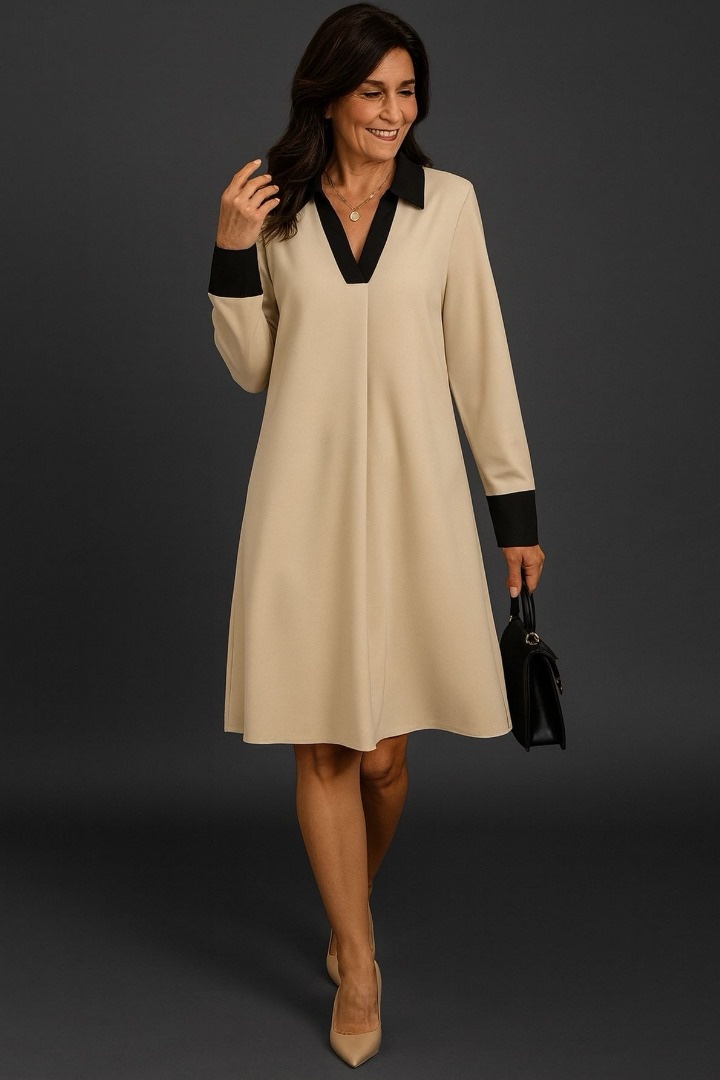 Vestido Elegante con Escote en V – Manga Larga, Ribete en Contraste, Mezcla de color